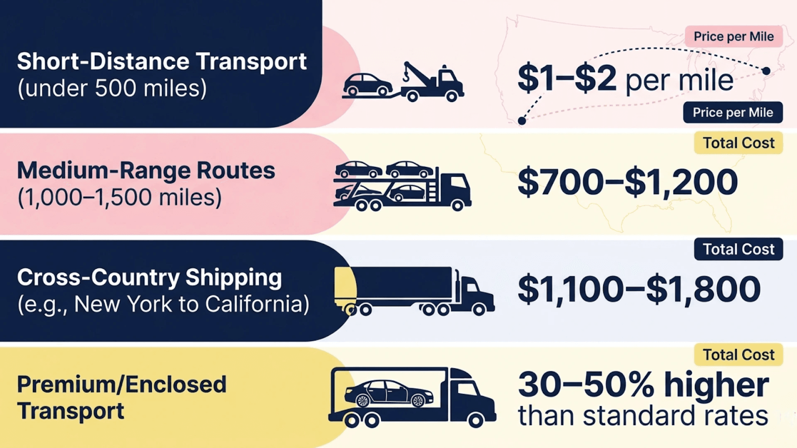 Cross-Country Shipping: Long-distance hauls, such as New York to California, usually fall within the $1,100 to $1,800 range, depending on vehicle size and seasonal demand.