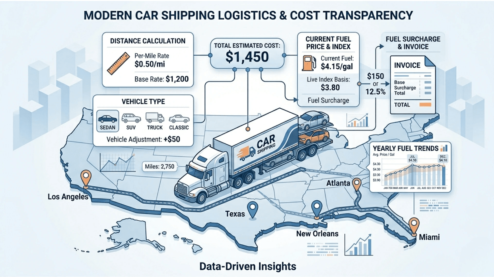 Consider a shipment from New York to Los Angeles (approximately 2,800 miles). A car shipping cost estimator might show a base rate of $1,200. However, if the fuel surcharge is currently set at 15% due to high diesel prices, an additional $180 would be added to the total. This ensures the carrier can cover the fuel needed for such a massive distance without cutting corners on safety or service quality.