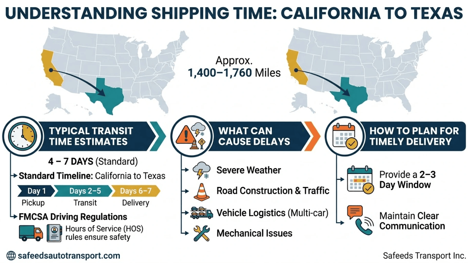 The shipping time from California to Texas generally falls between 4 and 7 days, depending on the specific route and weather conditions. While a solo driver could move faster, transporters must follow FMCSA regulations regarding driving hours.