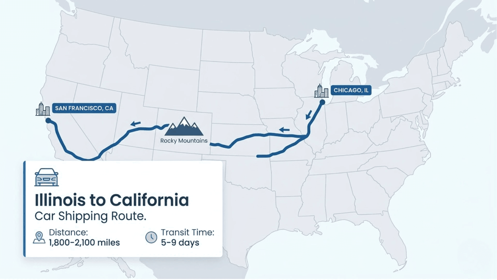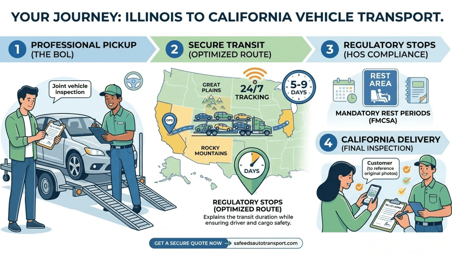 Shipping a car approximately 2,100 miles from Illinois to California typically takes 5 to 9 days. This timeline accounts for mandatory FMCSA driver rest periods and the logistical requirements of moving multiple vehicles on a single trailer across the country.