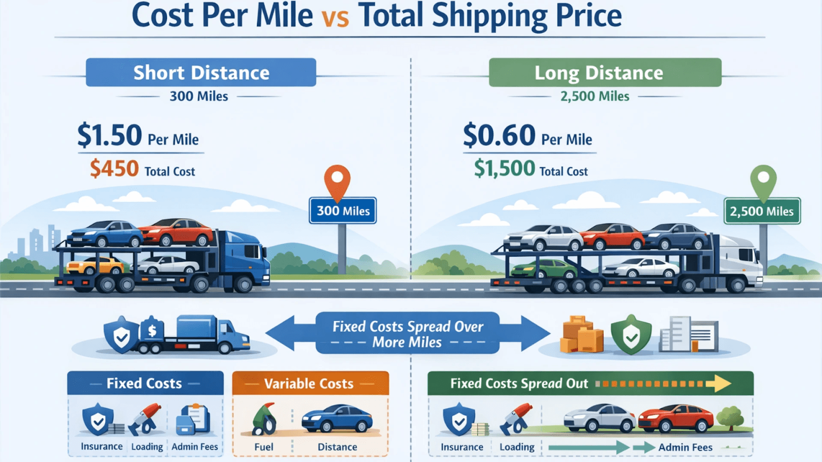 It is a common misconception that a lower per-mile rate automatically results in a lower total bill. While the per-mile metric is the engine of the quote, the total shipping price includes fixed costs that do not change regardless of distance. These include insurance coverage, administrative processing, and the labor required for loading and unloading the vehicle.
