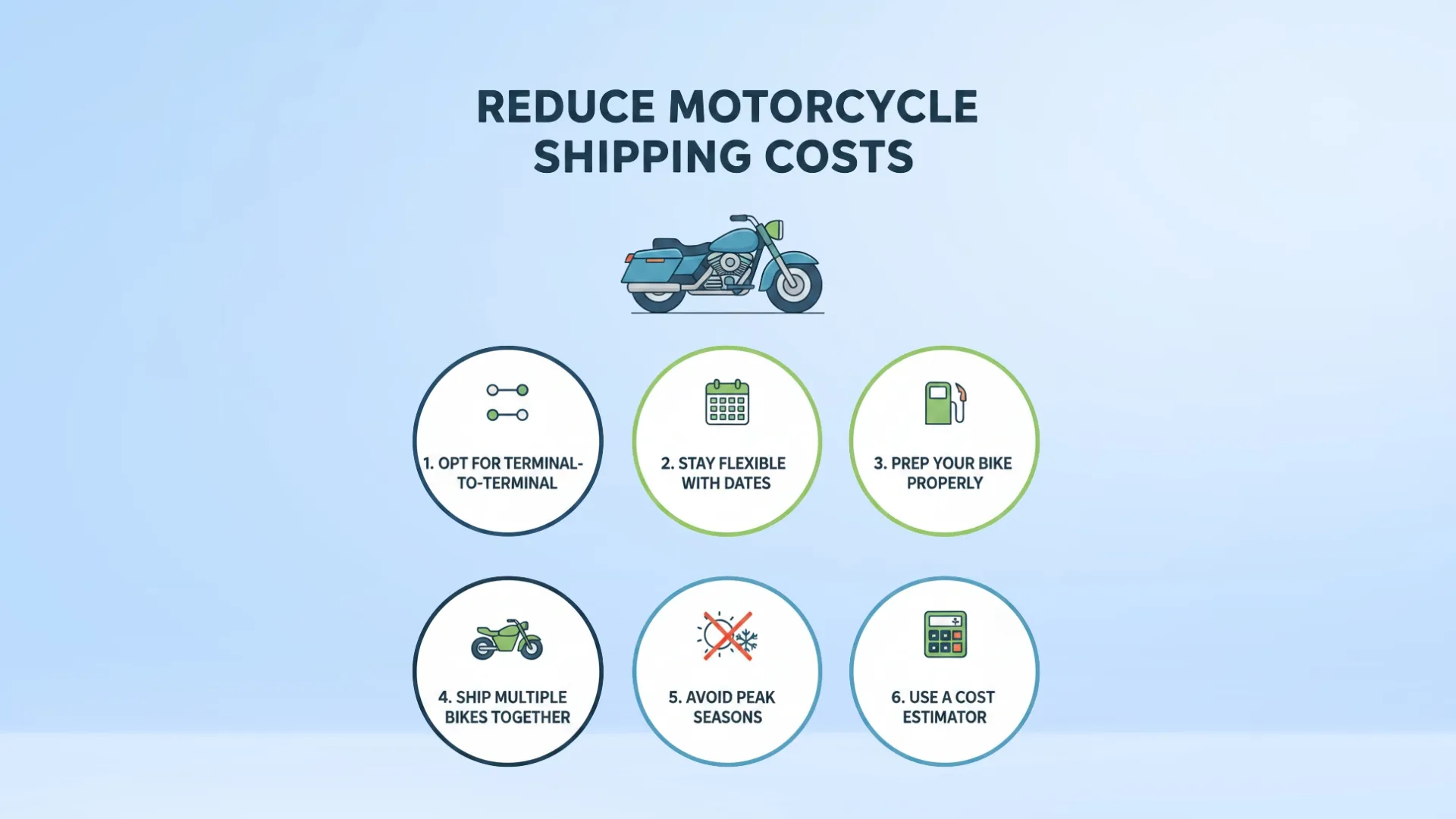Choose terminal-to-terminal shipping instead of door-to-door service when possible, as it reduces driver time and routing complexity, lowering the overall cost of shipping a motorcycle.