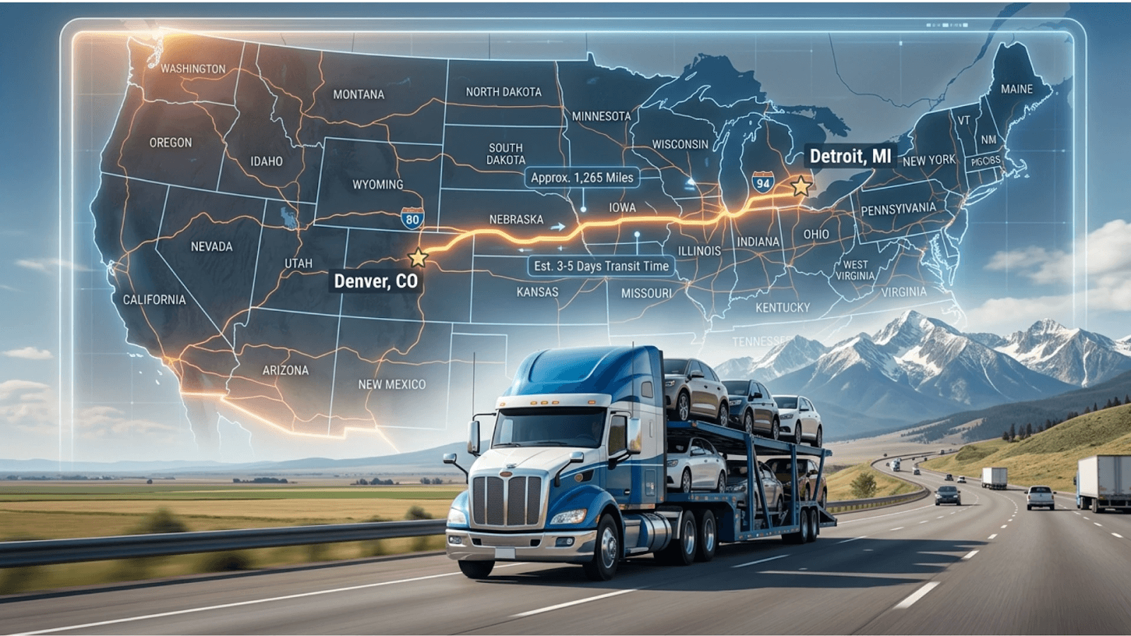 The total distance for this route typically ranges between 1,250 and 1,350 miles, depending on the specific cities involved in the transit. For instance, a move from Detroit to Denver covers approximately 1,265 miles, while trips to Colorado Springs may add slightly more distance. Most professional carriers can complete this journey in 3 to 5 days, accounting for mandatory driver rest periods and standard traffic patterns.