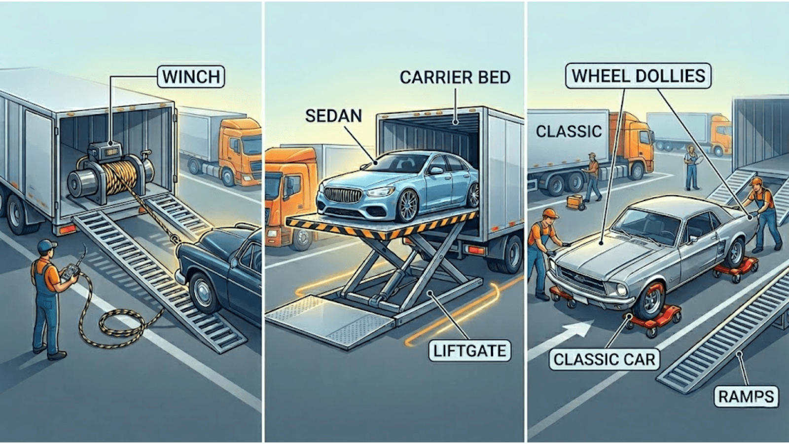 Carriers utilize several specialized tools to facilitate the move. The most common is the winch, a motorized cable system attached to the trailer that pulls the car up the loading ramps. For vehicles with extremely low ground clearance or those that cannot be winched, hydraulic lift gates are used to level the car with the trailer floor. In rare cases involving salvaged or wrecked vehicles, a forklift may be utilized at the terminal, though this is typically avoided for high-value or classic cars due to the risk of undercarriage contact.