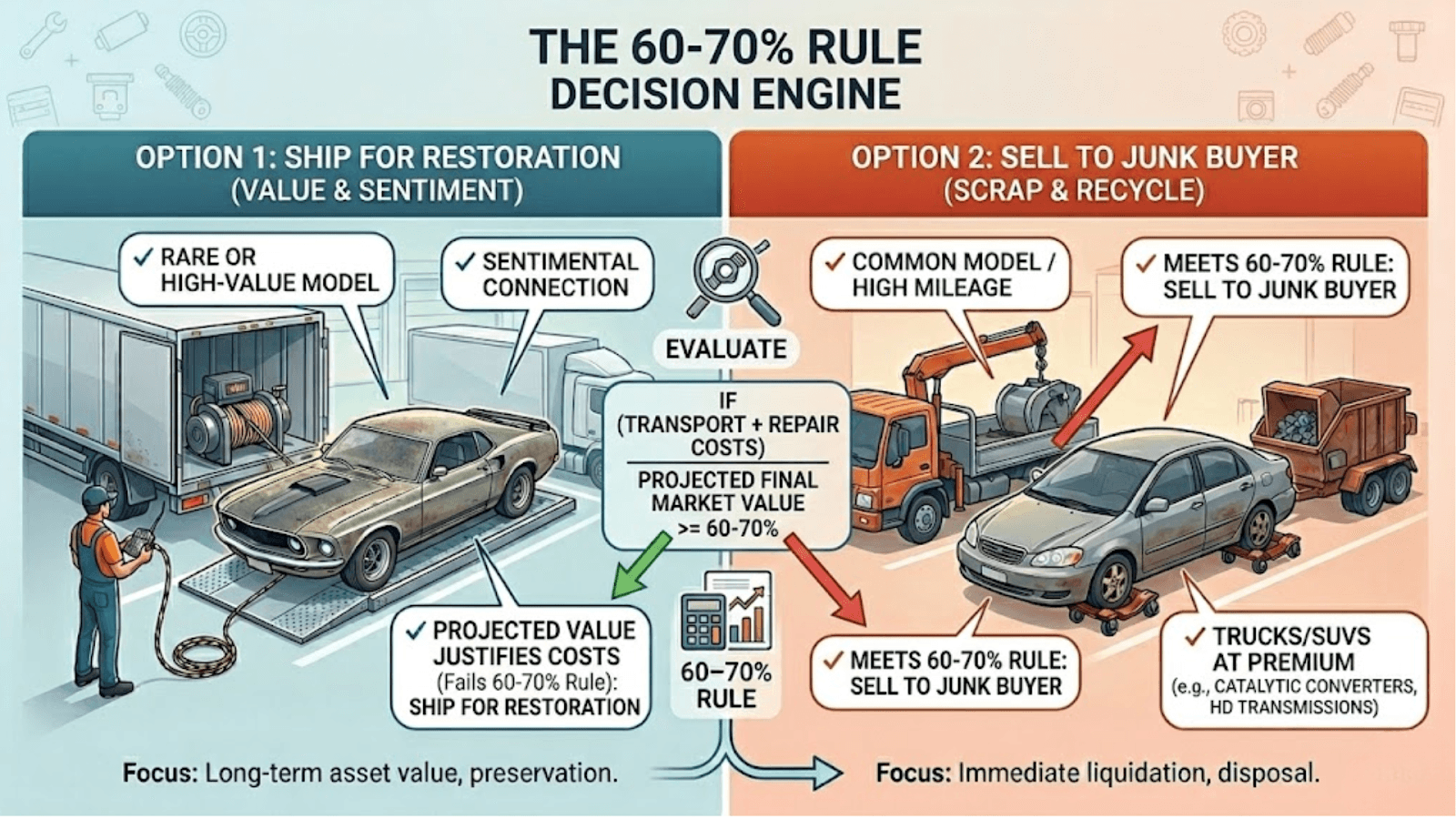 For many owners, the final decision often hinges on the 60–70% rule. If the combined cost to transport and repair the vehicle exceeds 70% of its projected final market value, it may be more strategic to seek out non-running car buyers. In the current market, mid-size sedans often fetch a standard scrap rate based primarily on weight, while trucks and SUVs can command higher prices due to the presence of high-value components like catalytic converters or heavy-duty transmissions. However, if the vehicle holds significant sentimental value or is a rare model targeted for professional restoration, the investment in shipping non-running cars is typically justified.